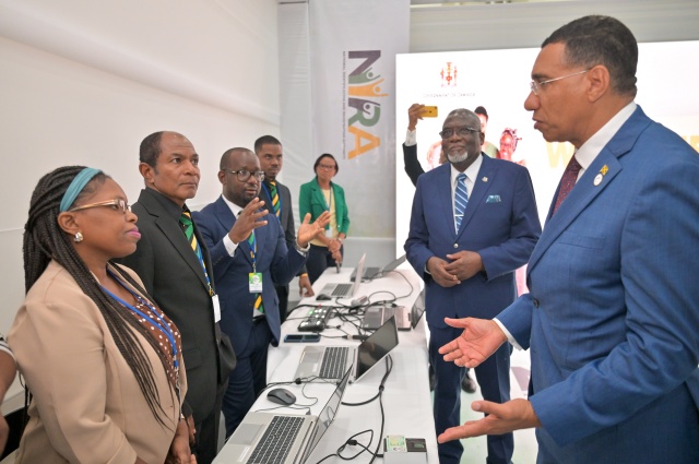 Prime Minister, Dr. the Most Hon. Andrew Holness (right) interacts with representatives from the National Identification and Registration Authority (NIRA) during a tour of booths at the Jamaica Constabulary Force (JCF) Transformations, People and Quality Technology Expo 2.0 at the Montego Bay Convention Centre in St. James on Sunday (July 6). Looking on (second right) is Custos of St. James, Bishop the Hon. Conrad Pitkin. The tour followed the opening ceremony of the 49th Regular Meeting of the Conference of Heads of Government of CARICOM, which is being held at the Convention Centre from July 6 to 8. During the tour, members of the JCF showcased various initiatives and innovations used in fighting crime.